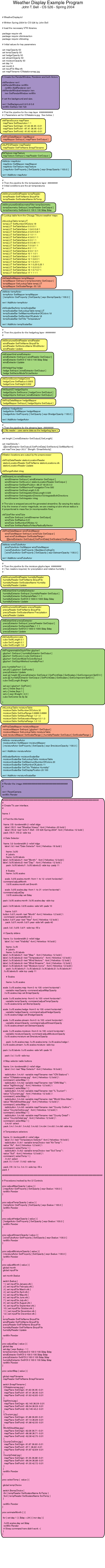 This file contains the complete code for the weather display example program. ( See the weather display project for full details. ) It has been color coded to highlight the sources, filters, mappers, actors, window renderers, and user interface components. Clicking on any of the colored boxes will jump to a specific page documenting that component of the pipeline.
