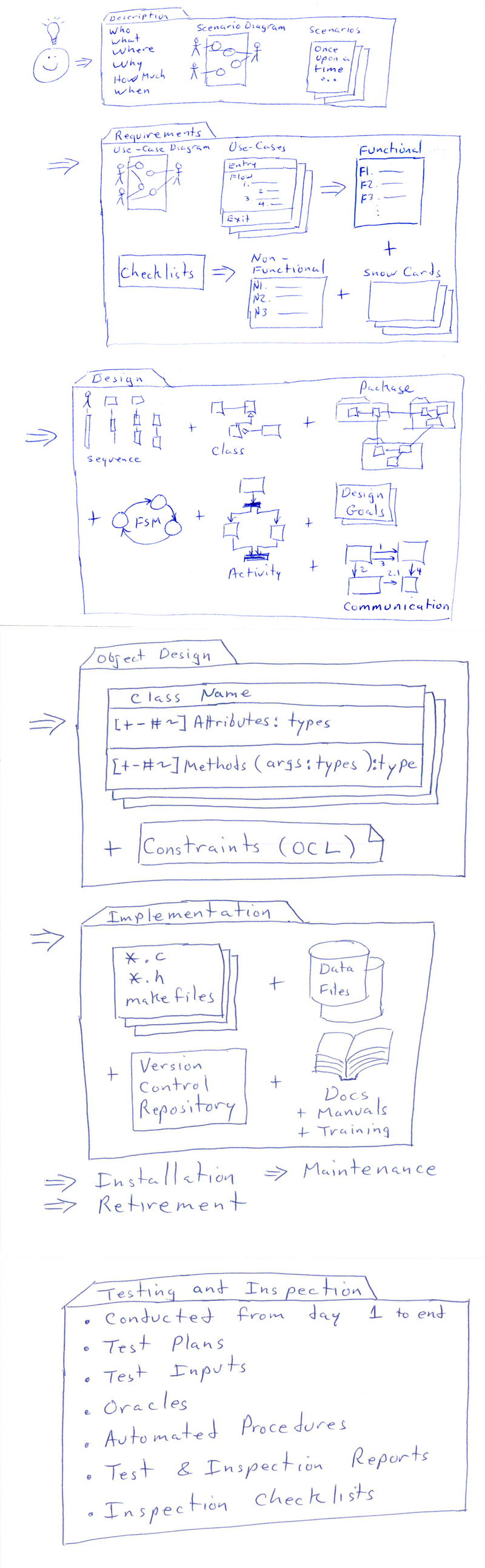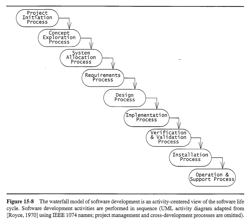 This is THE classic model of traditional software engineering, in which each activity must be completed before the next can begin. ( Water only flows downhill. Once you have started activity N+1, you can't go back to activity N. )