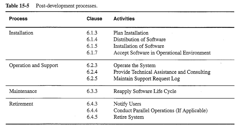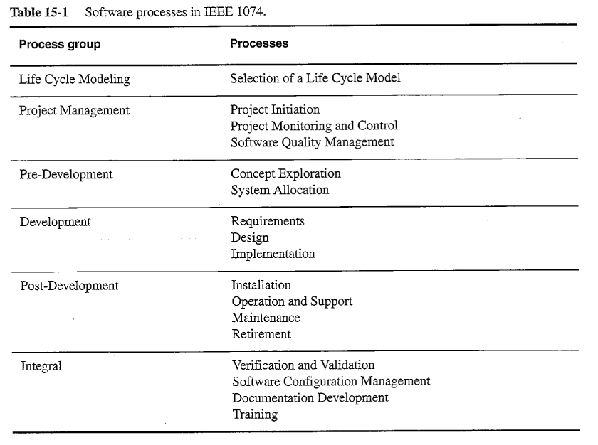 IEEE standard 1074describes in detail the activities that can be conducted in a software engineering process, broken down by processes and process groups: