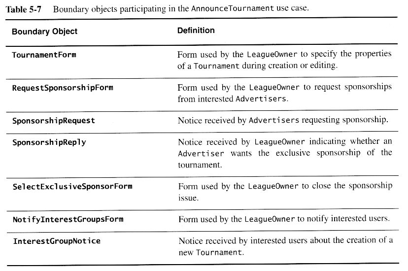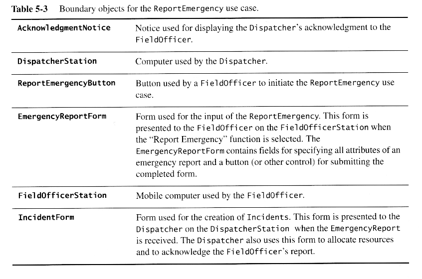 - Boundary objects represent an inteface as a whole, not the individual components that make it up. For example a data entry form would be a boundary object, but the individual fields, radio buttons, checkboxes, etc. on the form would not be modelled at this time.