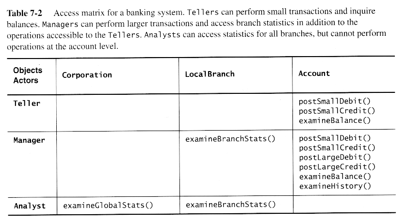 - As a two-dimensional table, where each table entry is a list of the permissions granted to that actor accessing that object.
