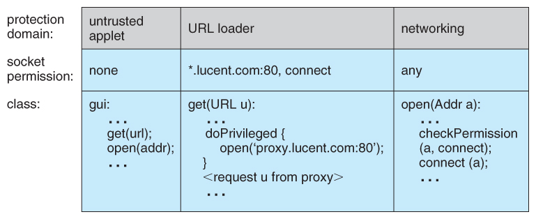 - In the example below the untrusted applet's call to get( ) succeeds, because the trusted URL loader asserts the privilege of opening the specific URL lucent.com. However when the applet tries to make a direct call to open( ) it fails, because it does not have privilege to access any sockets.