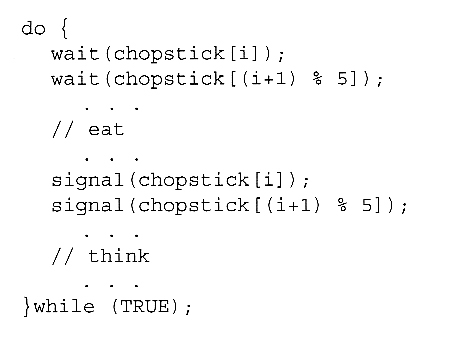 - One possible solution, as shown in the following code section, is to use a set of five semaphores ( chopsticks[ 5 ] ), and to have each hungry philosopher first wait on their left chopstick ( chopsticks[ i ] ), and then wait on their right chopstick ( chopsticks[ ( i + 1 ) % 5 ] )