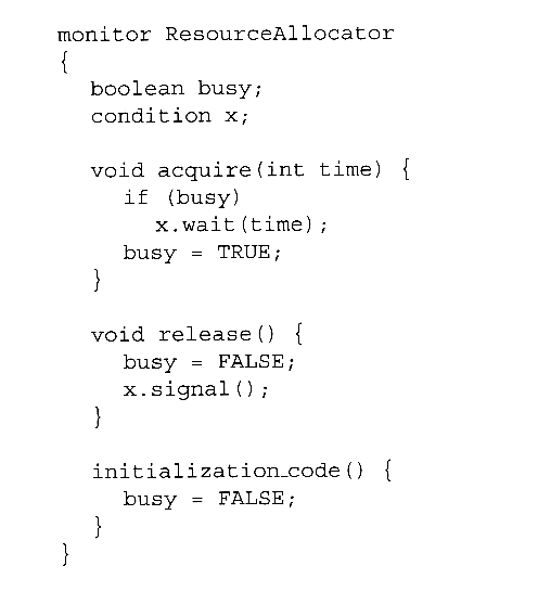 - Figure 5.19 illustrates the use of such a condition within a monitor used for resource allocation. Processes wishing to access this resource must specify the time they expect to use it using the acquire( time ) method, and must call the release( ) method when they are done with the resource.