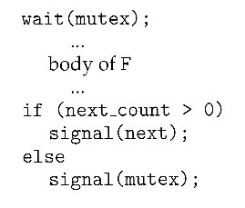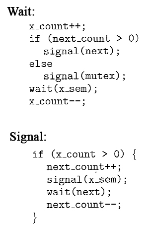 - One possible implementation of a monitor uses a semaphore "mutex" to control mutual exclusionary access to the monitor, and a counting semaphore "next" on which processes can suspend themselves after they are already "inside" the monitor ( in conjunction with condition variables, see below. ) The integer next_count keeps track of how many processes are waiting in the next queue. Externally accessible monitor processes are then implemented as: