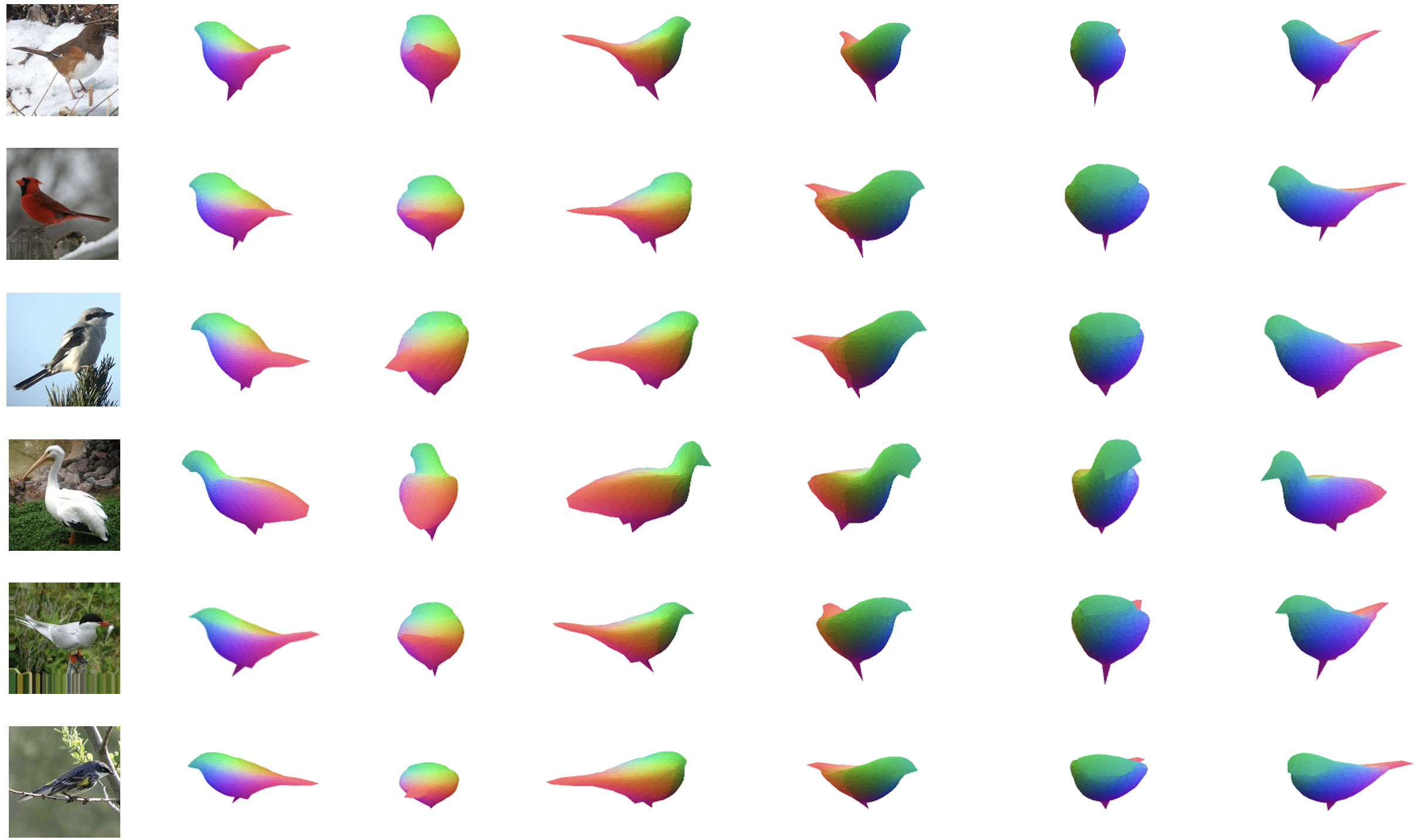 | The first column shows the input single-view image, while the remaining columns display reconstructions from six different viewpoints. No 3D annotations, including shape, pose, depth, or multi-view information, are used during training. |