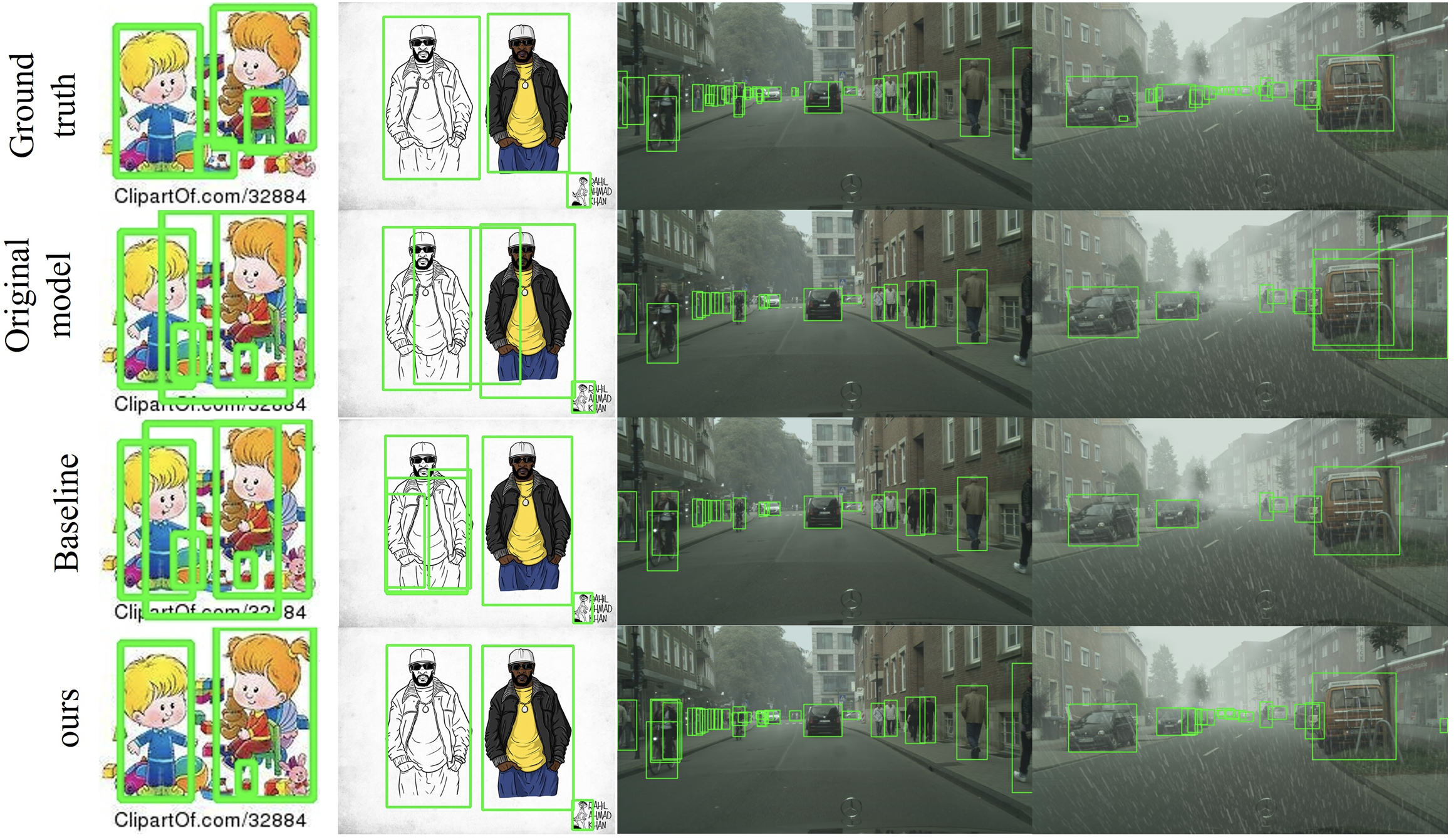 | Qualitative results of fully test-time adaptation for object detection. The first row is the ground truth of each image, the second row is the results of the pre-trained detector, the third row is the results of the self-training baseline, and the last row is the results of our proposed method. The object detection results are localized as green boxes. |