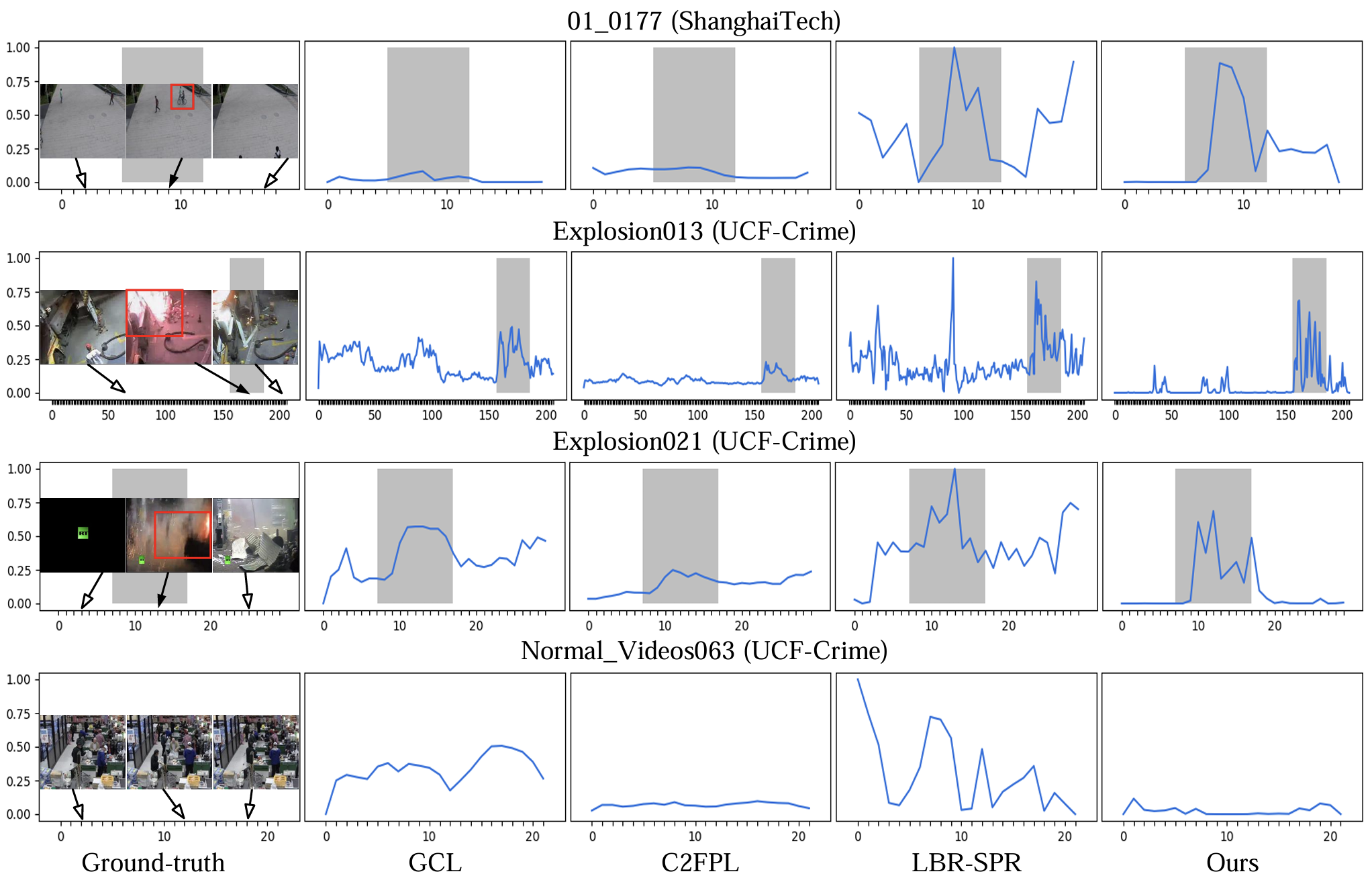 | Qualitative comparison with the state-of-the-art methods. Curves represent the predicted anomaly scores. The grey background corresponds to the ground truth. The white and black arrows denote the locations of normal and abnormal frames displayed on the left. |