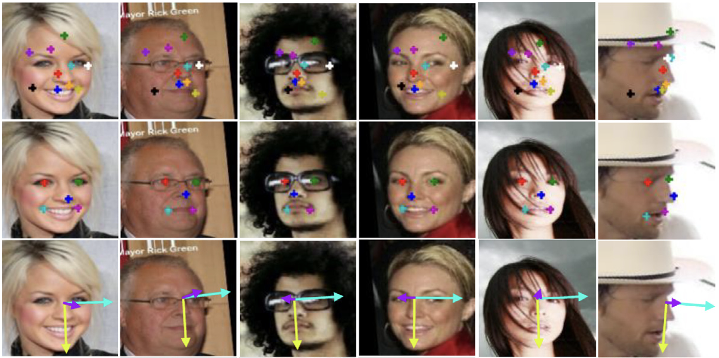 | Top row: unsupervised landmarks discovered by our approach. Middle row: semantic landmarks after alignment. Bottom row: head poses estimated by our approach. |