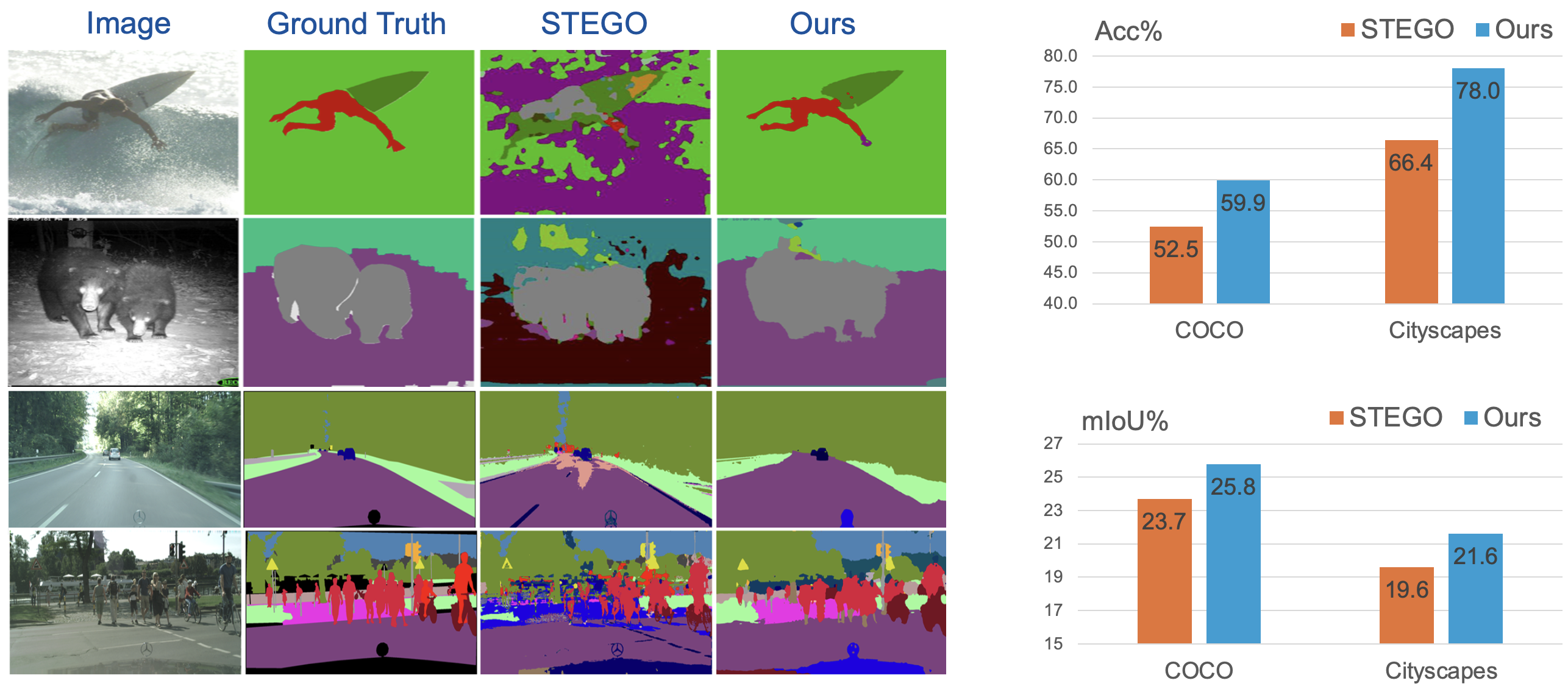 | Quantitative and qualitative comparisons between our approach with the state-of-the-art STEGO. |